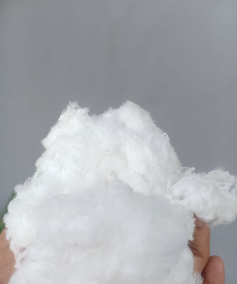 Recycled cotton fiber sourced from textile remnants, processed into clean and reusable fiber. Ideal for spinning, stuffing home living, and non-woven applications.